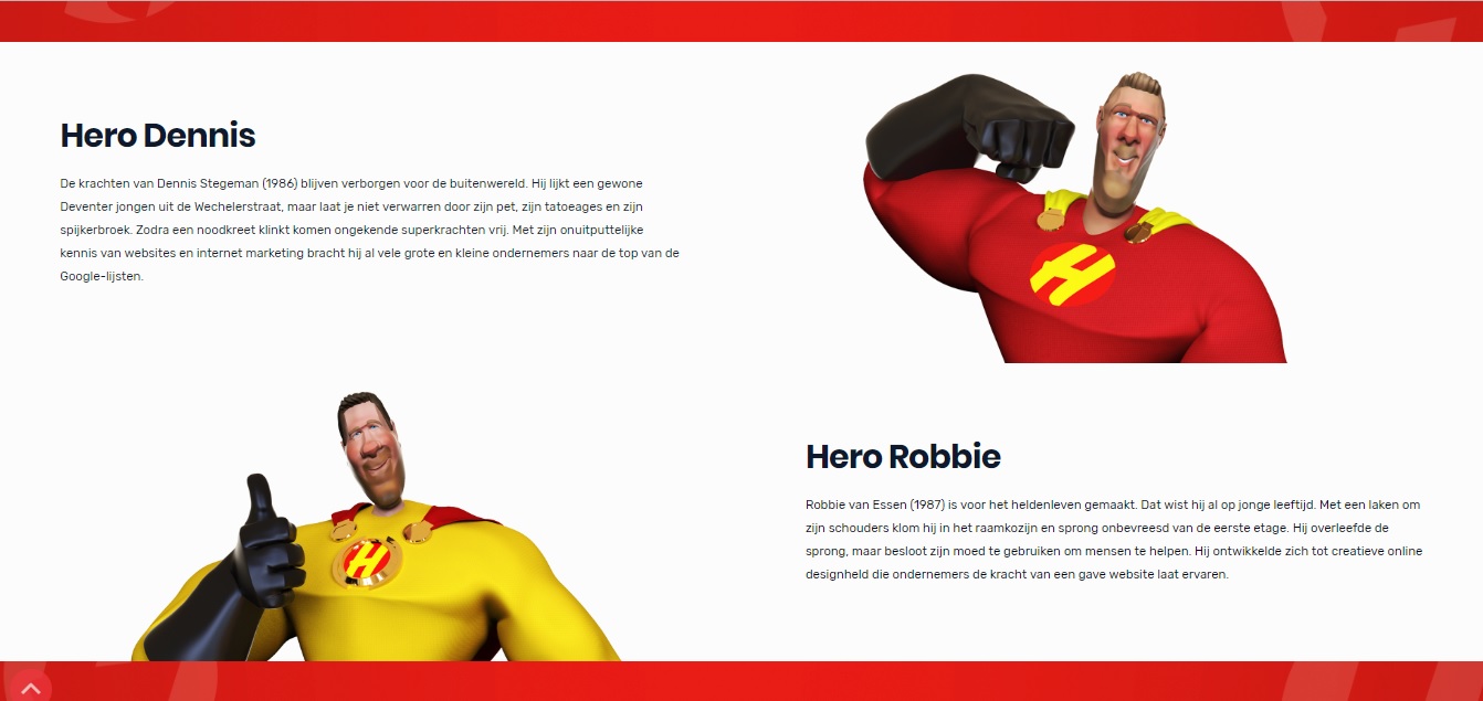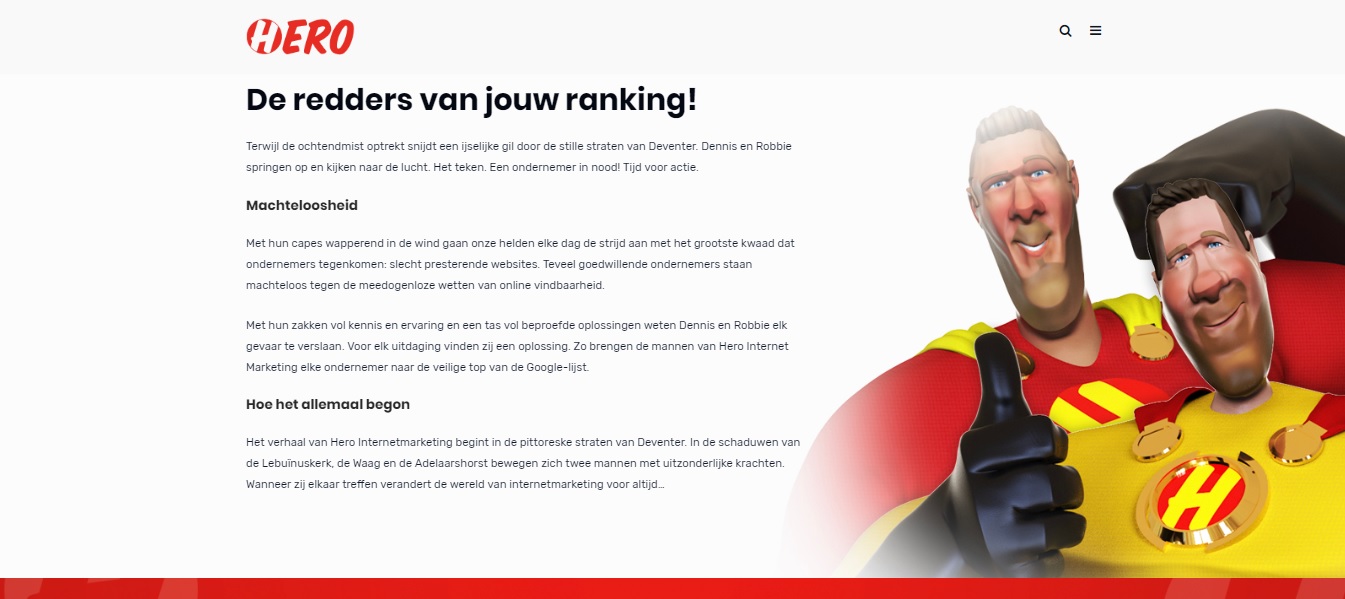 ‘Ons bedrijf staat voor servicegerichtheid en volledige ontzorging…’ blablabla. Wij internetbezoekers kunnen de gemiddelde Over Ons-pagina wel dromen. Een gemiste kans voor al die bedrijven. Want wat is een betere plek om je onderscheidend vermogen te laten zien dan een pagina die over jou gaat? De online marketeers van Hero Marketing begrijpen dat. Zij wilden een Over Ons verhaal dat past bij hun identiteit, begrijpelijk vertelt wat ze doen én opvalt in de massa. Ik liet me inspireren door hun verhaal en de oude comics van Marvel en DC en creëerde een Over Ons die je waarschijnlijk nergens anders zult zien. Met de Over Ons-tekst legde ik een basisverhaal voor het marketingbureau, dat als leidraad diende voor hun verdere webteksten en communicatie.