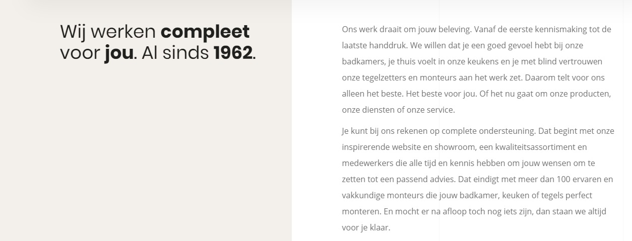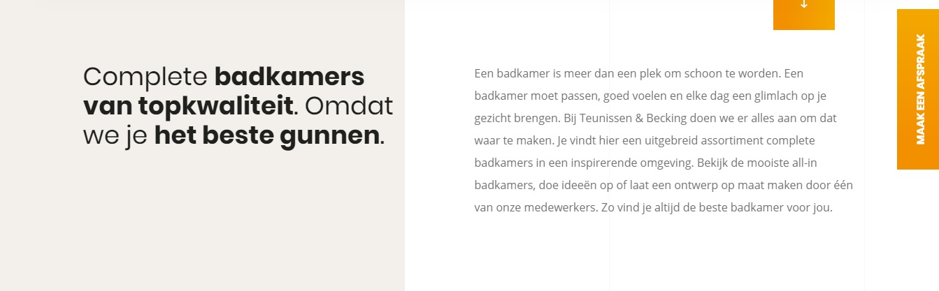 Teunissen & Becking staat voor klantgerichtheid. De beste keuken, badkamer of tegel voor jou. Ik vertaalde deze visie naar toegankelijke webteksten, waarin de lezer op informele wijze wordt aangesproken op zijn op haar behoeften. Dat betekent: webteksten in je-vorm, geschreven vanuit de wensen van de bezoeker en met een duidelijke call-to-action. Met de belofte van deskundigheid en betrokkenheid.